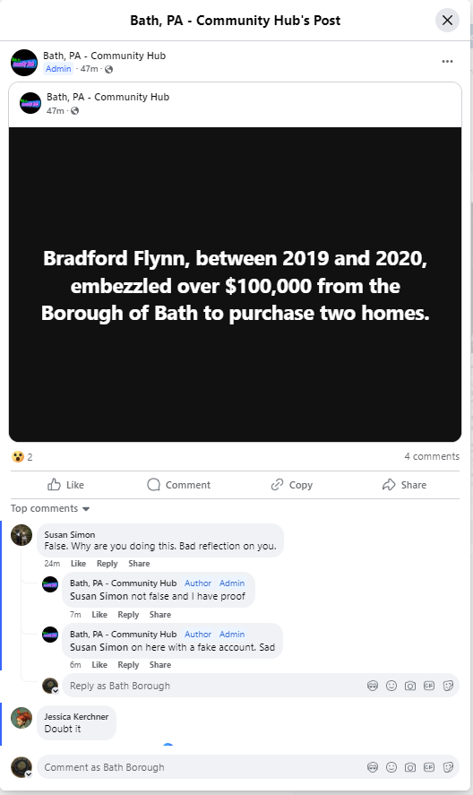 For almost two years now, Michael Long has parroted misappropriation of funds, fraud, embezzlement, nepotism, among other things about Borough officials and all without evidence. While Manager Flynn admits some of Bath’s inner-office practices were not perfect, there was in no way crimes committed. Long is widely using Borough data and information with his own bias to continually mis and disinform the public.