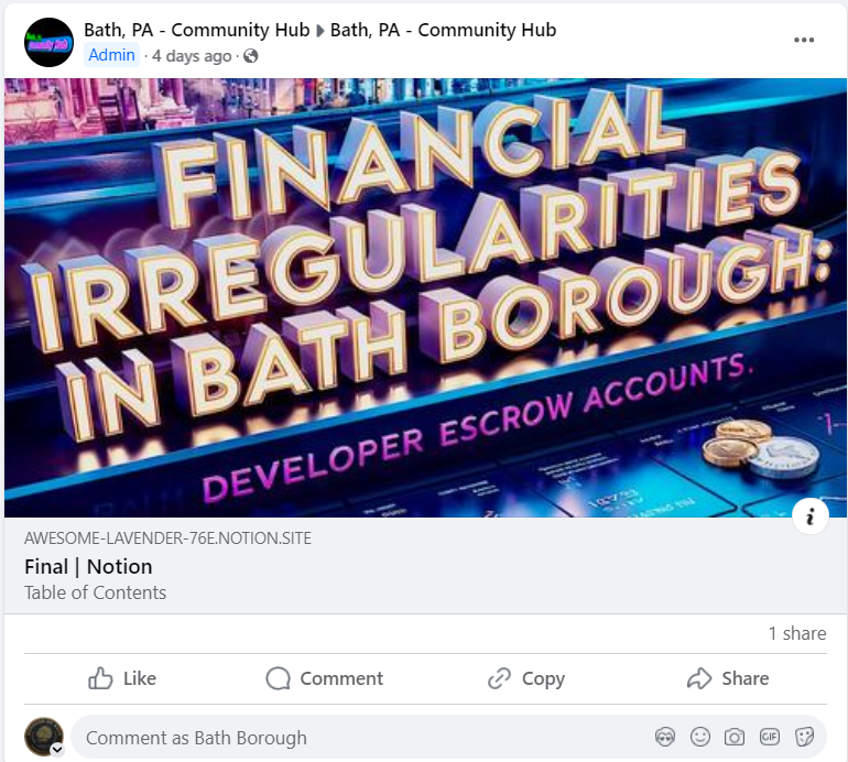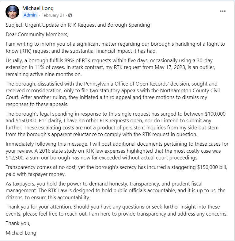 9 – Statement: “Transparency comes at no cost, yet the borough’s secrecy has incurred a staggering $150,000 bill, paid with taxpayer money.” Bath, PA Community Hub post (or repost) by Michael Long referencing a recent news story about how his right-to-know requests are costing the Borough of Bath.