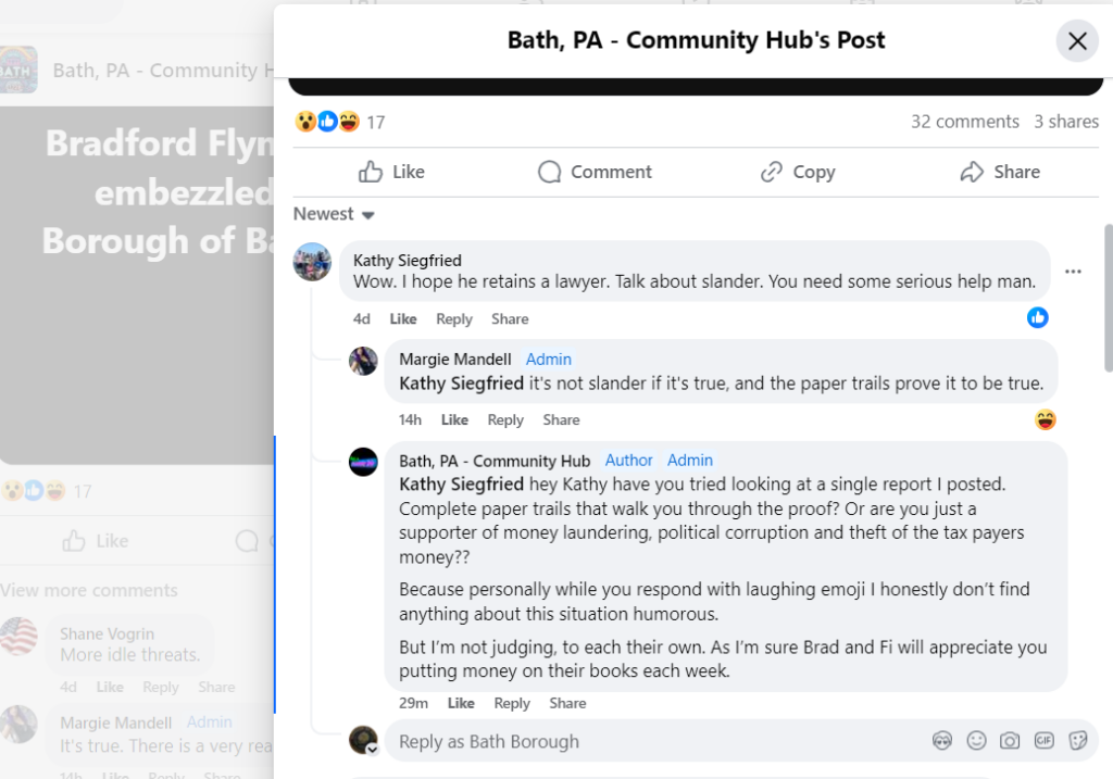 3 – Statement: “Sh*t like this is why I questioned what was going on back when the mayor blew you [Michael Long] up on Facebook to start…” Reese Post in General Bath, PA Community Hub post on or about July 12, 2024, by writer Sheryl Reese referencing the 69 News story ‘Resident’s multiple Right-to-Know requests could end up costing Bath taxpayers, borough manager says.