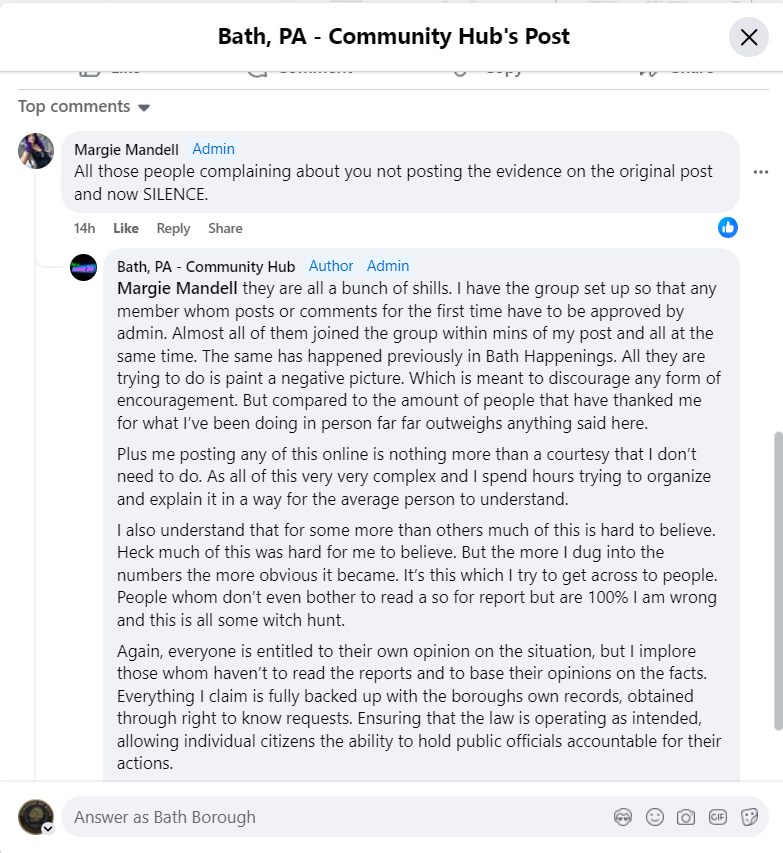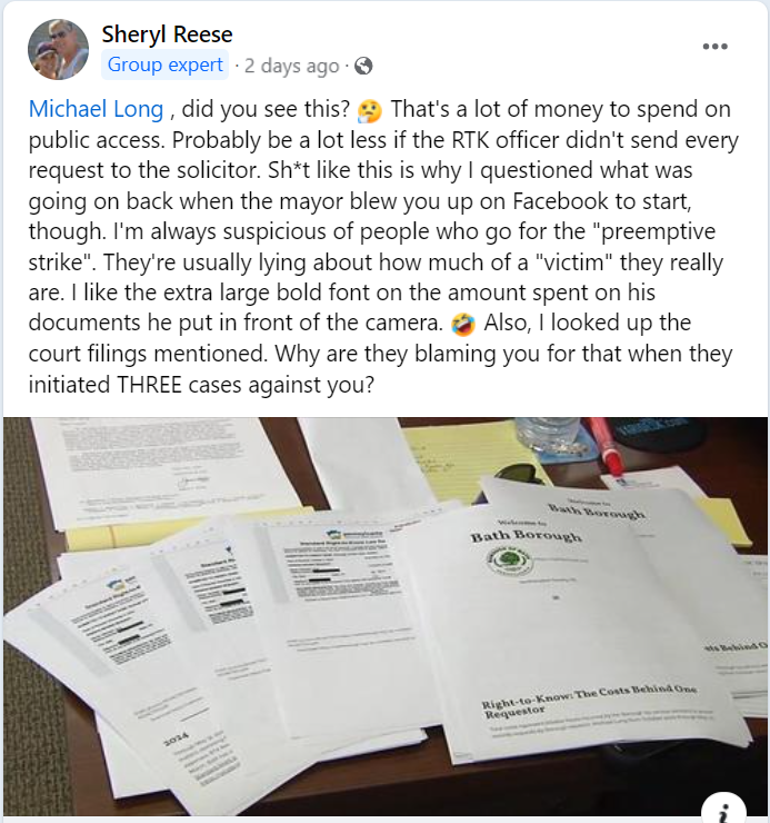 2 – Statement: “That’s a lot of money to spend on public access. Probably be a lot less if the RTK officer didn’t send every request to the solicitor.” Bath, PA Community Hub post on or about July 12, 2024, by writer Sheryl Reese referencing the 69 News story ‘Resident’s multiple Right-to-Know requests could end up costing Bath taxpayers, borough manager says.’