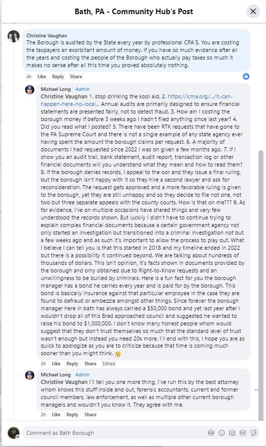8 – Statement: “A 2016 study on RTK law expenses highlighted that the most costly case was $12,500, a sum our Borough [Bath] has now far exceeded without actual court proceedings.” Bath, PA Community Hub post (or repost) by Michael Long February 21, 2024, then edited and/or reposted July 2024 referencing a recent news story about how his right-to-know requests are costing the Borough of Bath.