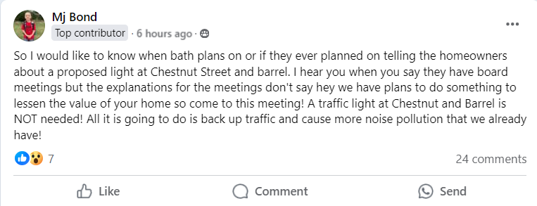 To suggest or imply that Bath secretly ‘plans on or if they ever planned on telling the homeowners about a proposed light at Chestnut Street and [Barrall]” could have been cleared up by just calling the Borough Office, then reporting those findings on social media. Or continue to criticize, either way. What’s wrong with calling first?