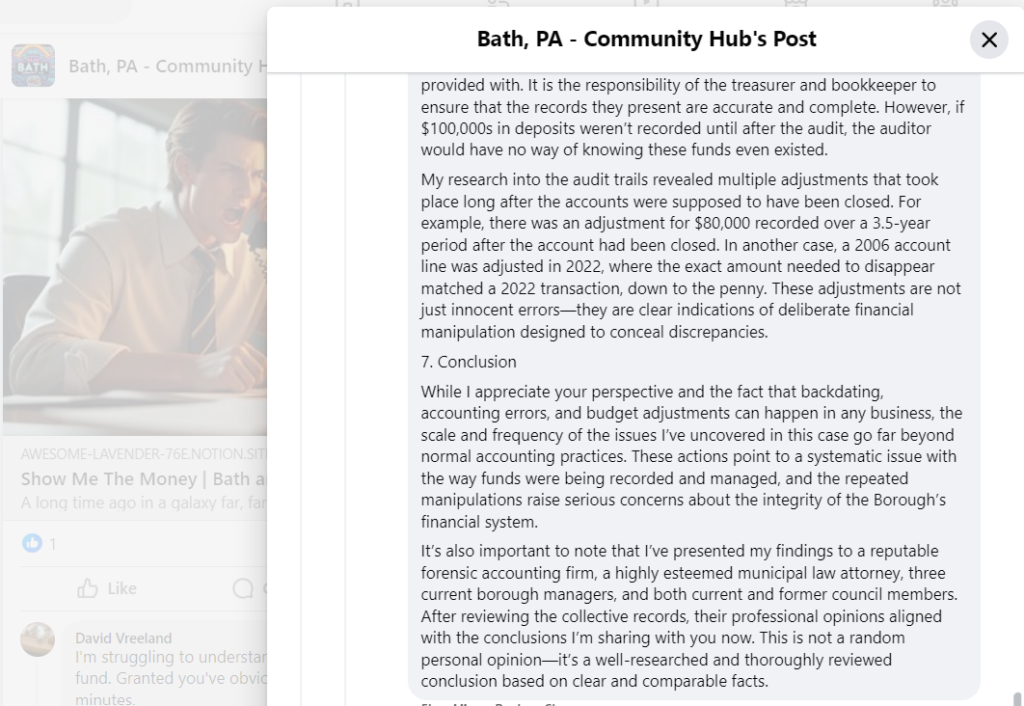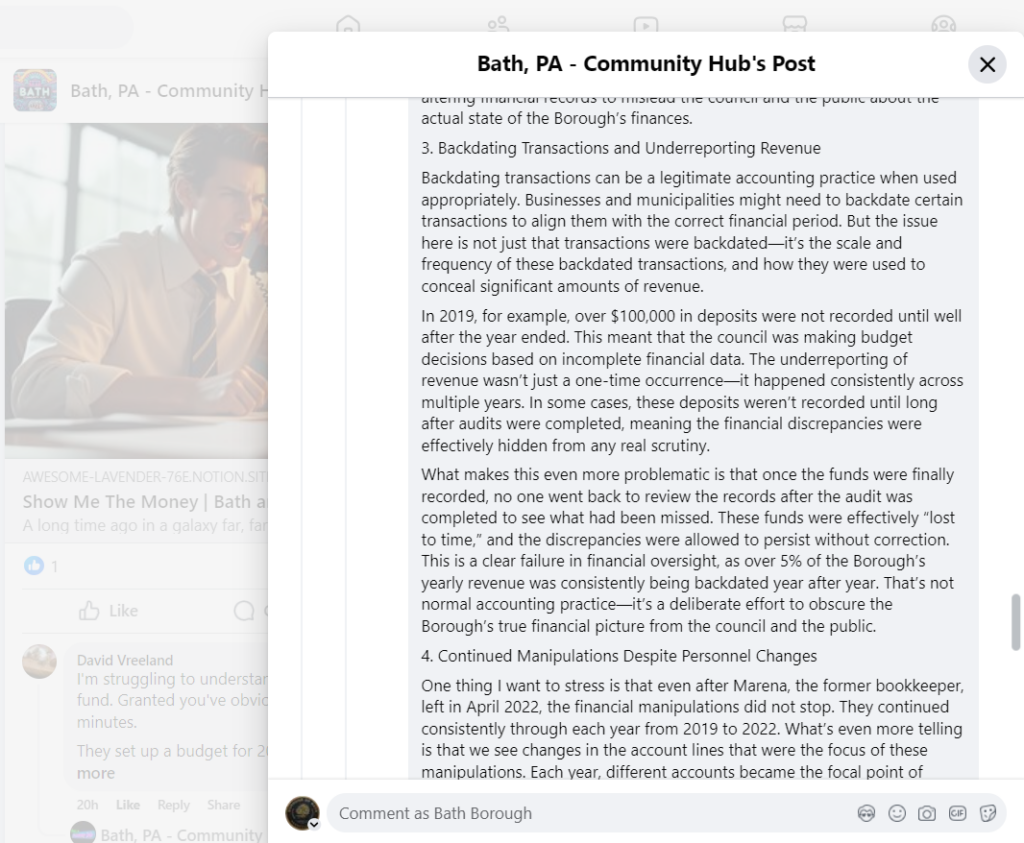 Michael Long Point #3 – Backdated transactions do occur. Bath’s previous bookkeepers handled nearly 30 accounts per month, while trying to complete other customer service and Borough operational tasks, and/or projects handed down from Borough Council, in addition to receiving tasks from Manager Flynn to complete. There were times when account reconciliations extended beyond 3 months for various reasons before accounts could be caught-up. There were no “hidden” or “obscure” cover-ups to misrepresent the Borough’s financial picture. Nothing in the record suggests, at all, the financial data entries were a deliberate effort to obscure the Borough’s financial picture, and this post doesn’t provide any evidence to support the claim that it does.
