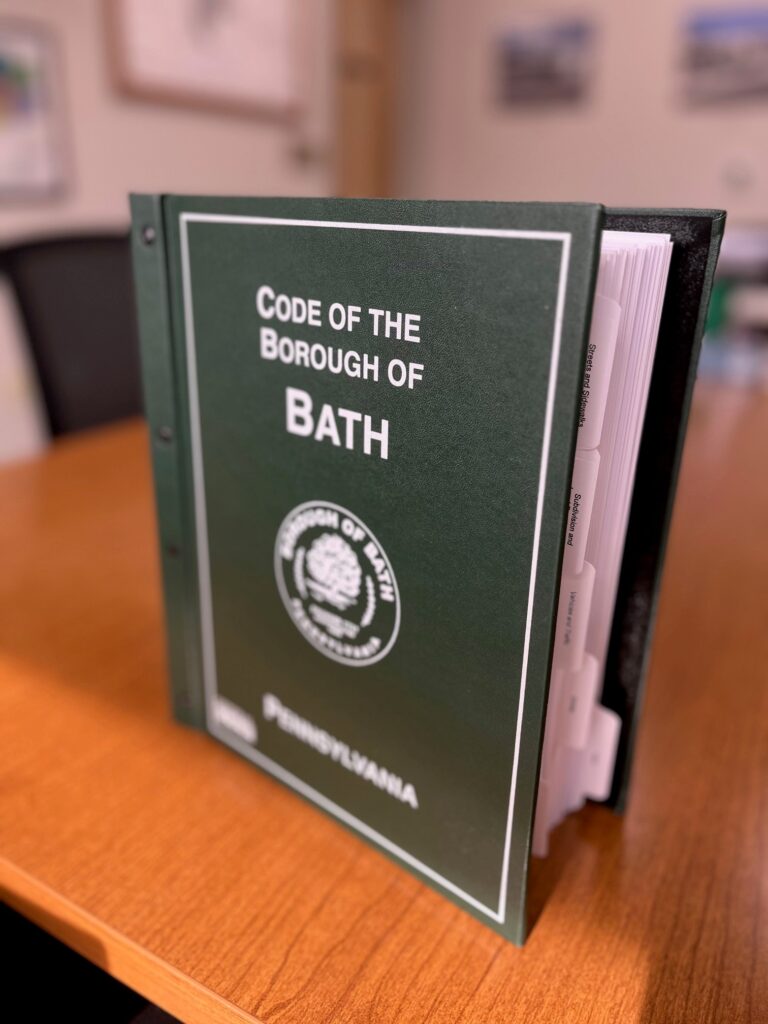 As part of the Borough’s overall efforts to improve services to its citizens, the Borough of Bath underwent a complete re-codification of its local laws on July 26, 2018. The last codification to have occurred in Bath was approximately 13 years earlier, making it difficult to understand the new laws that have been passed by Council from 2005 to 2018 that may have revised or replaced older laws.